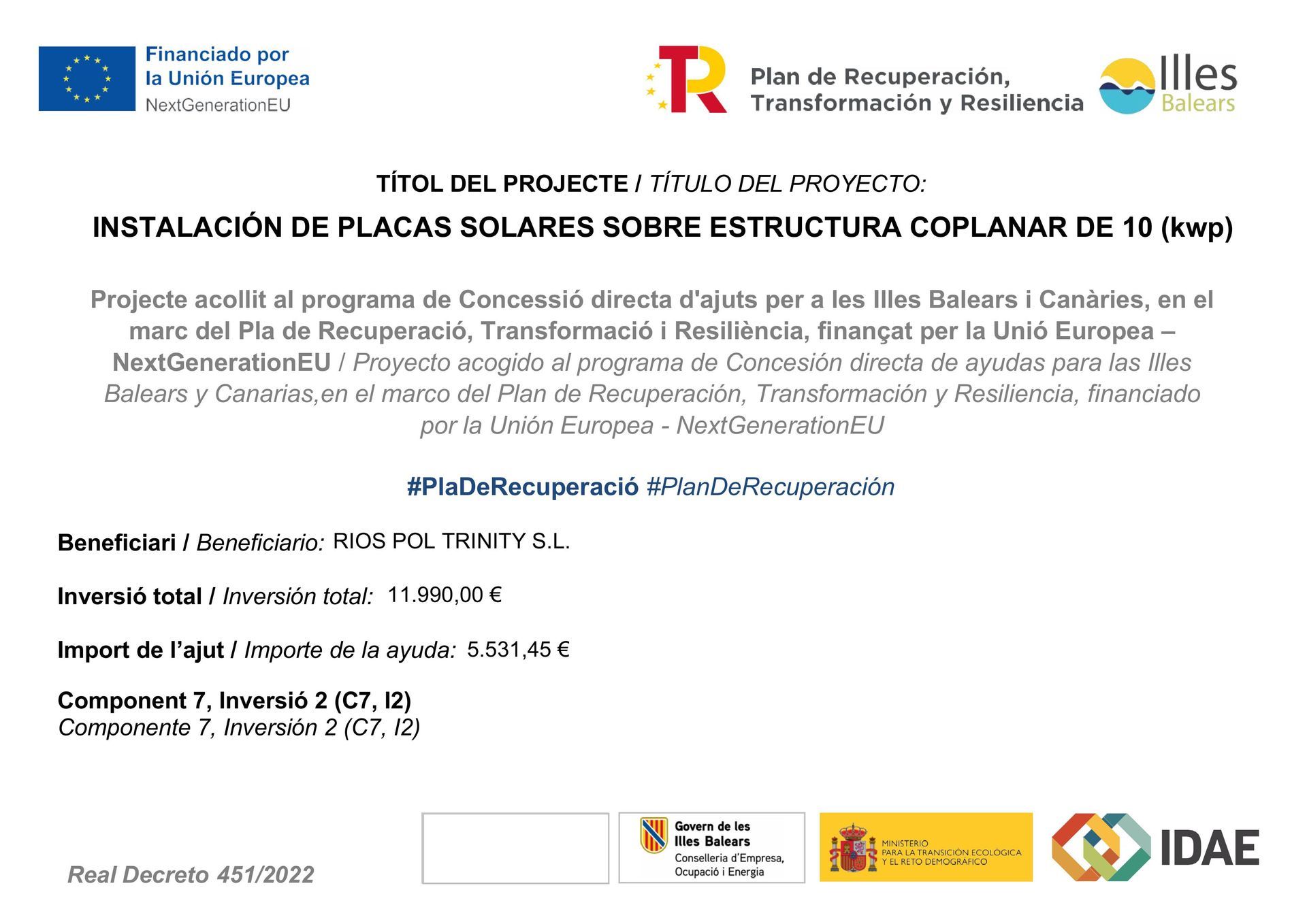 Ríos Pol Construcciones ha sido beneficiaria de una ayuda financiada por la Unión Europea – NextGenerationEU, dentro del Plan de Recuperación, Transformación y Resiliencia, en el marco del programa de concesión directa de ayudas para las Illes Balears y Canarias (Componente 7, Inversión 2 – Real Decreto 451/2022).